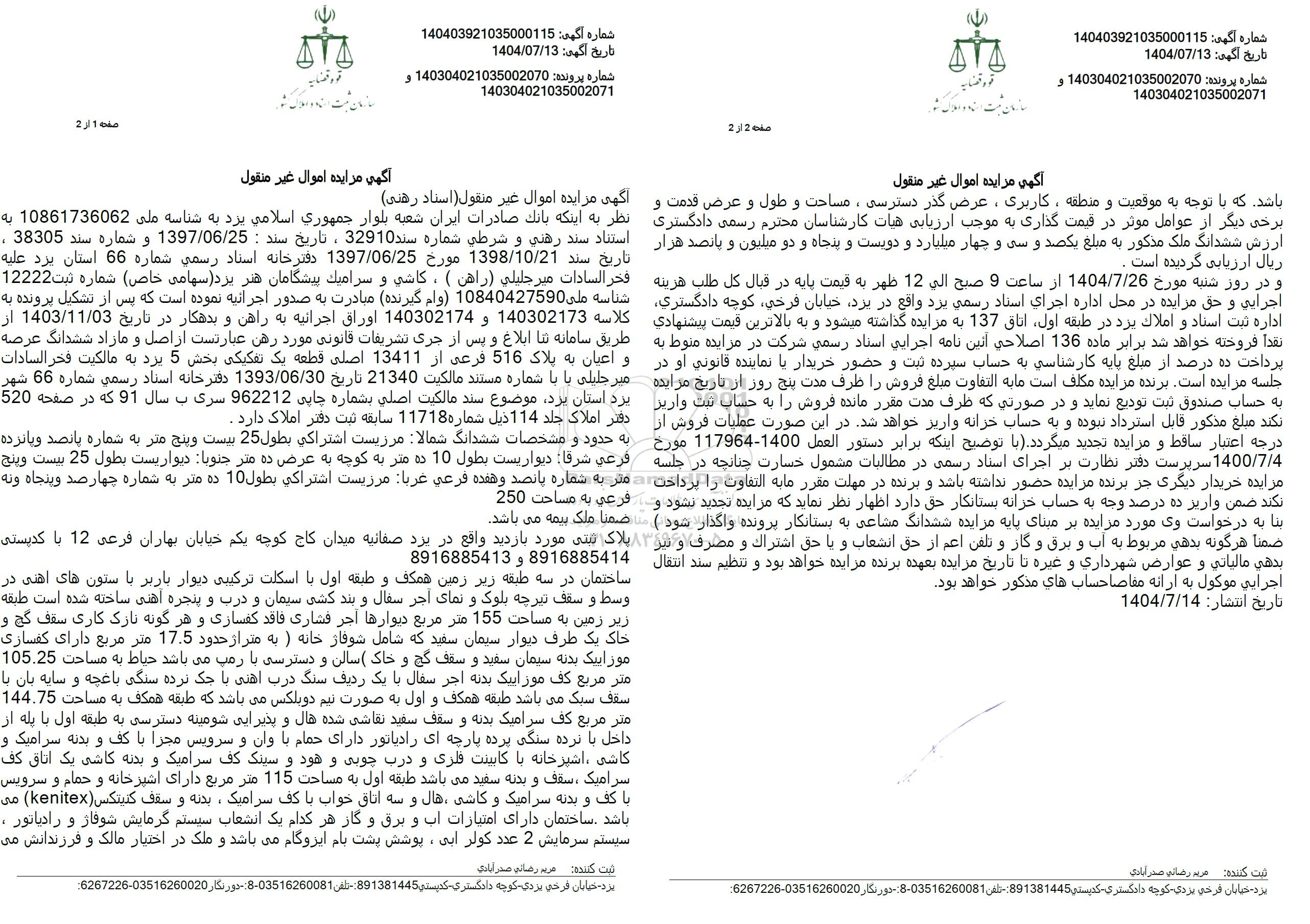 اگهی مزایده اموال غیر منقول (استاد رهنی)