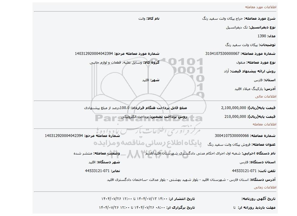 | شرح مورد معامله: حراج پیکان وانت سفید رنگ | نام کالا: وانت | |