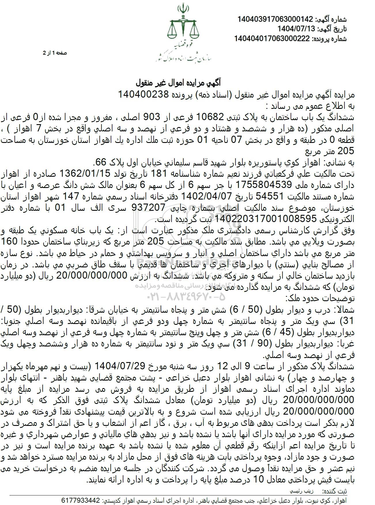 ششدانگ یک باب ساختمان به پلاک ثبتی 10682 فرعی از 903 اصلی ، مفروز و مجزا شده از 0 فرعی از اصلی مذکور ده هزار و ششصد و هشتاد و دو فرعی از نهصد و سه اصلی واقع در بخش 7 اهواز . قطعه 0 در طبقه و واقع در بخش 07 ناحیه 01 حوزه ثبت ملك اداره یک اهواز استان خوزستان به مساحت 205 متر مربع