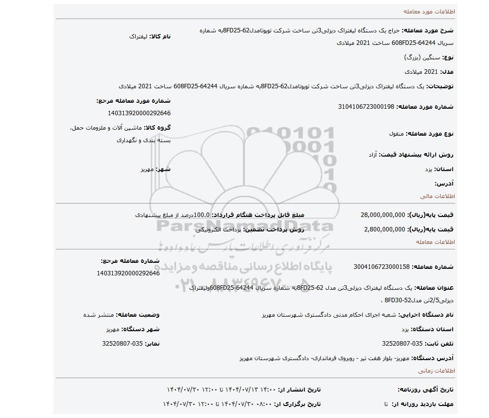 | شماره مورد معامله: 3104106723000198 | شماره مورد معامله مرجع: 140313920000292646 | |