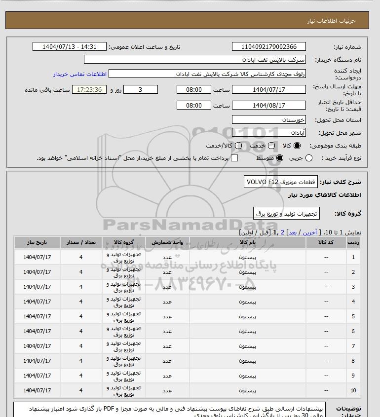 | 3 | -- | پیستون | عدد | تجهیزات تولید و توزیع برق | 4 | 1404/07/17 |