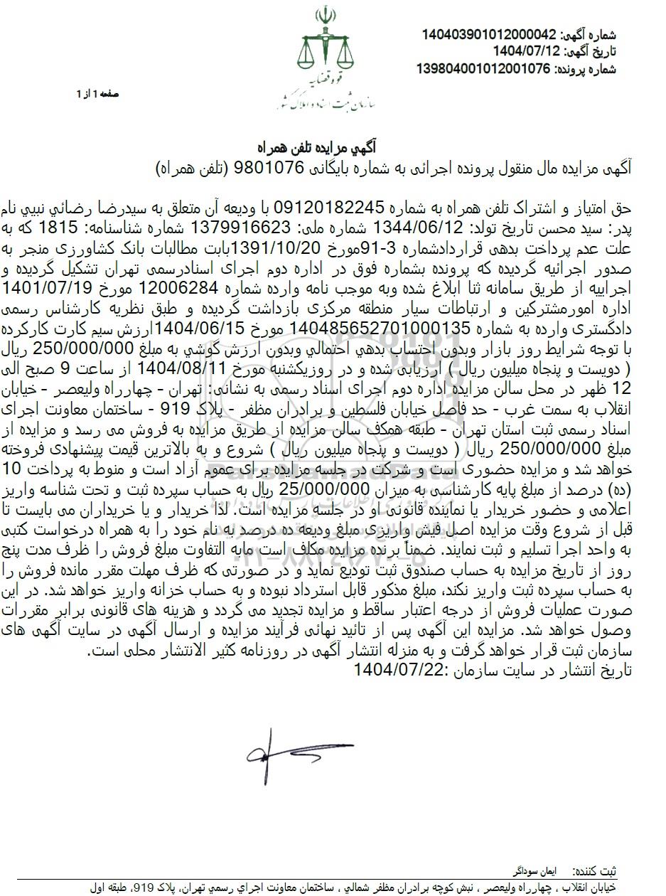 حق امتیاز و اشتراک تلفن همراه به شماره 09120182245 با ودیعه آن متعلق به سیدرضا رضائی نبیی نام پدر سید محسن تاریخ تولد: 1344.06.12 شماره ملی 1379916623 شماره شناسنامه: 1815 که به علت عدم پرداخت بدهی قرارداد شماره 91 مورخ 1391.10.20 بابت مطالبات بانک کشاورزی منجر به صدور اجرائیه گردیده که پرونده بشماره فوق در اداره دوم اجرای اسنادرسمی تهران تشکیل گردیده و اجراییه از طریق سامانه ثنا ابلاغ شده و به موجب نامه وارده شماره 12006284 مورخ 1401.07.19 اداره امور مشترکین و ارتباطات سیار منطقه مرکزی بازداشت گردیده و طبق نظریه کارشناس رسمی دادگستری وارده به شماره 140485652701000135 مورخ 1404.06.15 ارزش سیم کارت کارکرده با توجه شرایط روز بازار وبدون احتساب بدهی احتمالی وبدون ارزش گوشی به مبلغ 250.000.000 ریال دویست و پنجاه میلیون ریال ارزیابی شده و در روز یکشنبه مورخ 1404.08.11 از ساعت 9 صبح الی 12 ظهر در محل سالن مزایده اداره دوم اجرای اسناد رسمی به نشانی تهران - چهارراه ولیعصر - خیابان انقلاب به سمت غرب - حد فاصل خیابان فلسطین و برادران مظفر - پلاک 919 - ساختمان معاونت اجرای اسناد رسمی ثبت استان تهران - طبقه همکف سالن مزایده از طریق مزایده به فروش می رسد و مزایده از مبلغ 250.000.000 ریال دویست و پنجاه میلیون ریال شروع و به بالاترین قیمت پیشنهادی فروخته خواهد شد و مزایده حضوری است و شرکت در جلسه مزایده برای عموم آزاد است و منوط به پرداخت 10 (ده) درصد از مبلغ پایه کارشناسی به میزان 25.000.000 ریال به حساب سپرده ثبت و تحت شناسه واریز اعلامی و حضور خریدار یا نماینده قانونی او در جلسه مزایده است. لذا خریدار و یا خریداران می بایست تا قبل از شروع وقت مزایده اصل فیش واریزی مبلغ ودیعه ده درصد به نام خود را به همراه درخواست کتبی به واحد اجرا تسلیم و ثبت نمایند. ضمناً برنده مزایده مکلف است ما به التفاوت مبلغ فروش را ظرف مدت پنج روز از تاریخ مزایده به حساب صندوق ثبت تودیع نماید و در صورتی که ظرف مهلت مقرر مانده فروش را به حساب سپرده ثبت واریز نکند مبلغ مذکور قابل استرداد نبوده و به حساب خزانه واریز خواهد شد. در این صورت عملیات فروش از درجه اعتبار ساقط و مزایده تجدید می گردد و هزینه های قانونی برابر مقررات وصول خواهد شد. مزایده این آگهی پس از تایید نهانی فرآیند مزایده و ارسال آگهی در سایت آگهی های سازمان ثبت قرار خواهد گرفت و به منزله انتشار آگهی در روزنامه کثیر الانتشار محلی است. تاریخ انتشار در سایت سازمان : 1404.07.22