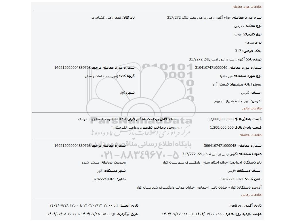 مزایده، آگهی  زمین  زراعی  تحت  پلاک  317/272