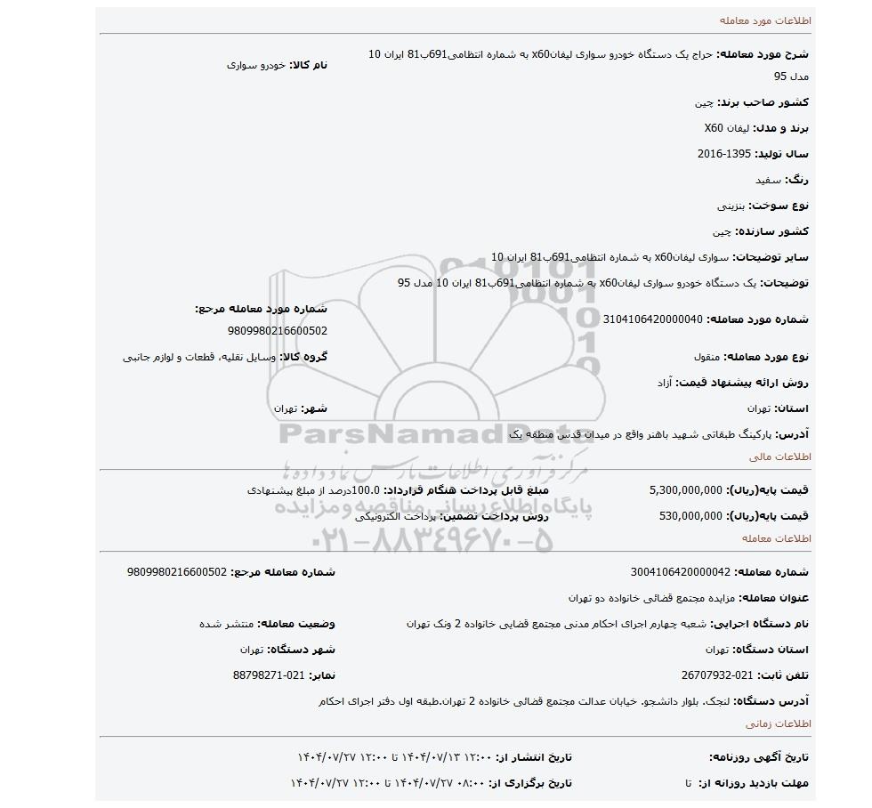 | توضیحات: یک دستگاه خودرو سواری لیفانx60 به شماره انتظامی691ب81 ایران 10 مدل 95 | ||