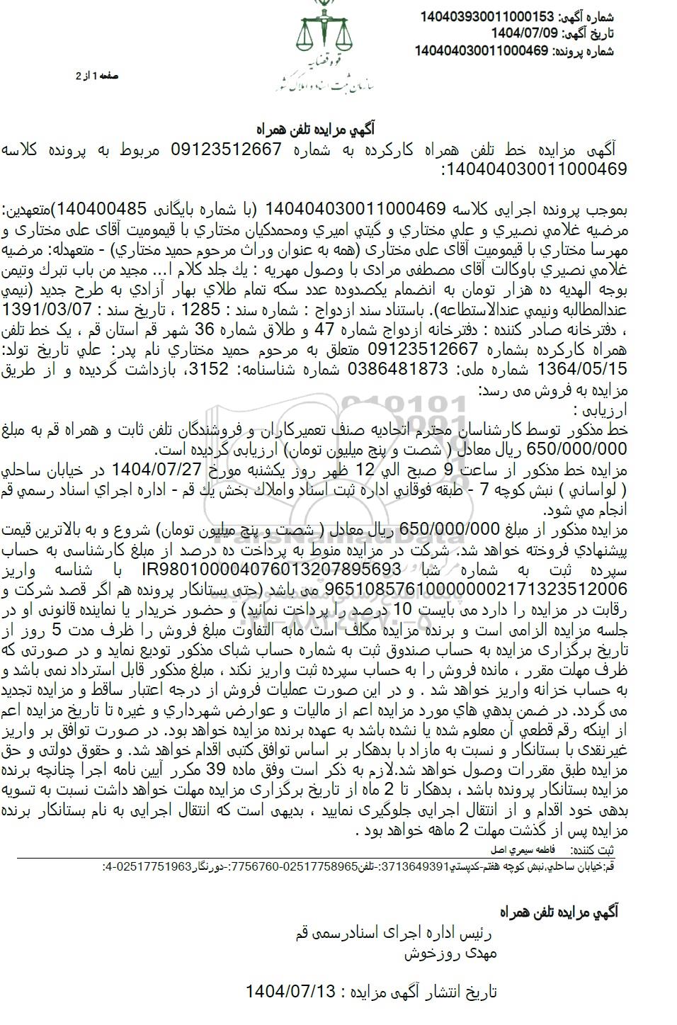 آگهی مزایده خط تلفن همراه کار کرده به شماره 09123512667 مربوط به پرونده کلاسه :140404030011000469