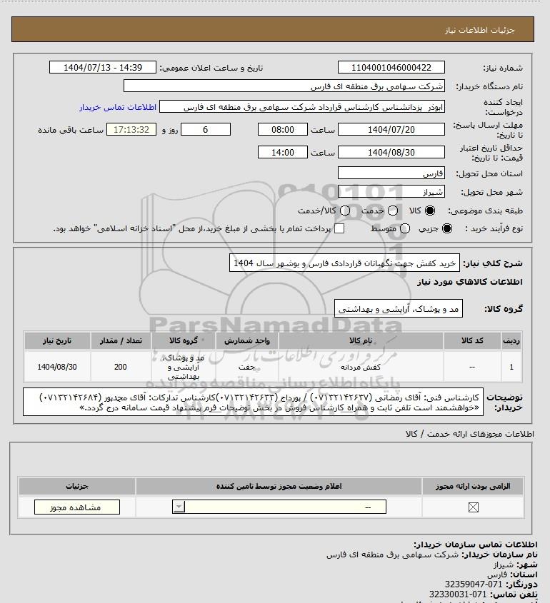 شرح کلی نیاز: خرید کفش جهت نگهبانان قراردادی فارس و بوشهر سال 1404