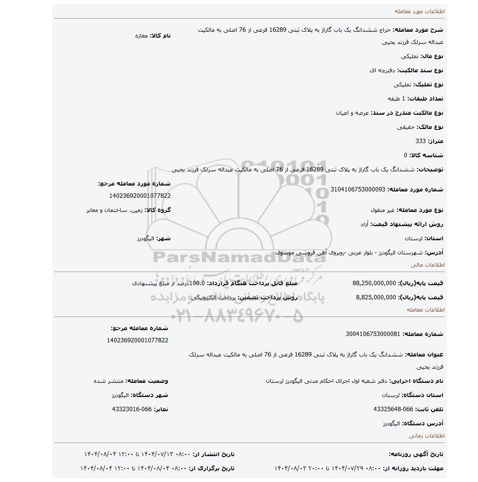 مزایده عمومی مزایده ششدانگ یک باب گاراژ به پلاک ثبتی 16289 فرعی از 76 اصلی به مالکیت عبداله سرلک فرزند یحیی برگزار میگردد. از کلیه افراد متخصص و شرکت‌های واجد شرایط دعوت به عمل می‌آید تا در این مزایده با کد خبرگزاری پارس نماد : 9649377 شرکت نمایند تاریخ شروع مزایده : 1404/07/13 مهلت شرکت در مزایده: تا پایان روز 1404/08/04 مکان برگزاری اموال واگذاری استان‌های لرستان و دسته‌بندی‌های مربوط به این حراجی املاک و زمین میباشد.