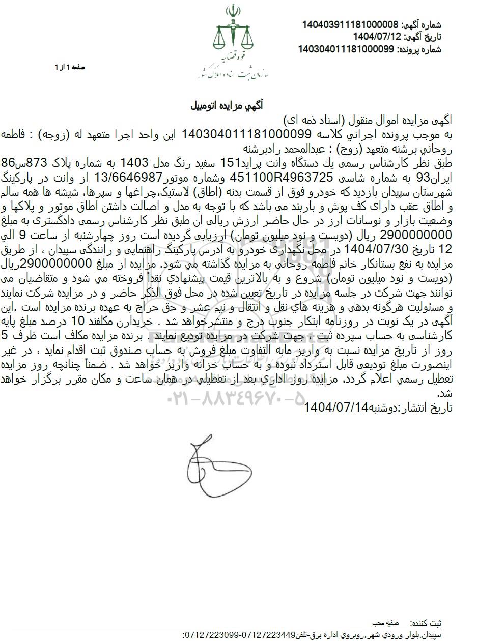 طبق نظر کارشناس رسمی يک دستگاه وانت پراید 151 سفید رنگ مدل 1403 به شماره پلاک 873 س 86 ایران 93 به شماره شاسی 451100R4963725 و شماره موتور 13.6646987 از وانت در پارکینگ شهرستان سپیدان بازدید که خودرو فوق از قسمت بدنه (اطاق) لاستیک چراغها و سپرها، شیشه ها همه سالم و اطاق عقب دارای کف پوش و باربند میباشد که با توجه به مدل و اصالت داشتن اطاق موتور و پلاکها و وضعیت بازار و نوسانات ارز در حال حاضر ارزش ریالی ان طبق نظر کارشناس رسمی دادگستری به مبلغ 2900000000 ریال دویست و نود میلیون تومان ارزیابی گردیده است روز چهارشنبه از ساعت 9 الي 12 تاریخ 1404.07.30 در محل نگهداری خودرو به آدرس پارکینگ راهنمایی و رانندگی سپیدان ، از طریق مزایده به نفع بستانکار خانم فاطمه روحانی به مزایده گذاشته میشود مزایده از مبلغ 2900000000 ريال دویست و نود میلیون تومان شروع و به بالاترین قیمت پیشنهادي نقداً فروخته مي شود و متقاضیان می توانند جهت شرکت در جلسه مزایده در تاریخ تعیین شده در محل فوق الذکر حاضر و در مزایده شرکت نمایند و مسئولیت هرگونه بدهی و هزینه های نقل و انتقال و نیم عشر و حق حراج به عهده برنده مزایده است . این آگهی در یک نوبت در روزنامه ابتکار جنوب درج و منتشر خواهد شد. خریدارن مکلفند 10 درصد مبلغ پایه کارشناسی به حساب سپرده ثبت، جهت شرکت در مزایده تودیع نمایند. برنده مزایده مکلف است ظرف 5 روز از تاریخ مزایده نسبت به واریز مابه التفاوت مبلغ فروش به حساب صندوق ثبت اقدام نماید ، در غیر اینصورت مبلغ تودیعی قابل استرداد نبوده و به حساب خزانه واریز خواهد شد. ضمنا چنانچه روز مزایده تعطیل رسمی اعلام گردد مزایده روز اداری بعد از تعطیلی در همان ساعت و مکان مقرر برگزار خواهد شد.