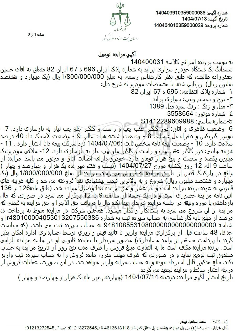 ششدانگ یک دستگاه خودرو سواری پراید به شماره پلاک ایران 696 د 67 ایران 82 متعلق به آقای حسین جعفرزاده طالشی که طبق نظر کارشناس رسمی به مبلغ 1.800.000.000 ریال (یک میلیارد و هشتصد میلیون ریال) ارزیابی شده ، با مشخصات خودرو به شرح ذیل:
