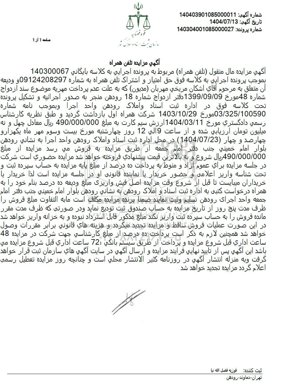 آگهی مزایده مال منقول تلفن همراه مربوط به پرونده اجرایی به کلاسه بایگانی 140300067 بموجب پرونده اجرايي به کلاسه فوق حق امتیاز و اشتراک تلفن همراه به شماره 09124208297 و وديعه آن متعلق به مرحوم آقاي اشكان مريخي مهربان (مدیون) که به علت عدم پرداخت مهریه موضوع سند ازدواج شماره 48 مورخ 1399.09.09 دفتر ازدواج شماره 18 رودهن منجر به صدور اجرائیه و تشکیل پرونده تحت کلاسه فوق در اداره ثبت اسناد و املاک رودهن واحد اجرا وبموجب نامه شماره 03.325.100590 مورخ 1403.10.29 شرکت همراه اول بازداشت گردید و طبق نظریه کارشناس رسمي دادگستري مورخ 1404.03.11 ارزش سیم کارت به مبلغ 490.000.000 ریال معادل چهل و نه میلیون تومان ارزيابي شده و از ساعت 9 الی 12 روز چهارشنبه مورخ بیست و سوم مهر ماه یکهزارو چهارصد و چهار (1404.07.23) در محل اداره ثبت اسناد و املاک رودهن واحد اجرا به نشاني رودهن بلوار امام خميني جنب دفتر امام جمعه از طریق مزایده به فروش می رسد مزایده از مبلغ 490.000.000 ريال شروع و به بالاترین قیمت پیشنهادی فروخته خواهد شد مزایده حضوری است شرکت در جلسه مزایده برای عموم آزاد و منوط به پرداخت ده درصد از مبلغ پایه مزایده به حساب سپرده ثبت و تحت شناسه واریز اعلامی و حضور خریدار یا نماینده قانونی او در جلسه مزایده است لذا خریدار یا خریداران میبایست تا قبل از شروع وقت مزایده اصل فیش واریزی مبلغ ودیعه ده درصد بنام خود را به همراه درخواست کتبی به اداره ثبت اسناد و املاک رودهن به نشاني رودهن بلوار امام خميني جنب دفتر امام جمعه واحد اجرای رودهن تسلیم و ثبت نمایند ضمنا برنده مزایده مکلف است ما به التفاوت مبلغ فروش را ظرف مدت پنج روز از تاریخ مزایده به حساب صندوق ثبت تودیع نماید و در صورتی که ظرف مدت مقرر مانده فروش را به حساب سپرده ثبت واریز نکند مبلغ مذکور قابل استرداد نبوده و به خزانه واریز خواهد شد در این صورت عملیات فروش ساقط و مزایده تجدید میگردد و هزينه هاي قانوني برابر مقررات وصول خواهد شد همچنین لازم به ذکر است پرداخت ده درصد از مبلغ كارشناسي جهت شرکت در مزایده 48 ساعت اداري قبل شروع مزایده و پرداخت از طریق سیستم بانکی 72 ساعت اداري قبل شروع مزايده مي باشد این آگهی پس از تایید نهایی فرایند مزایده و ارسال آگهی در سایت آگهي هاي سازمان ثبت قرار خواهد گرفت و به منزله انتشار آگهی در روزنامه کثیر الانتشار محلي است و چنانچه روز مزایده تعطیل رسمی اعلام گردد مزایده تجدید خواهد شد
