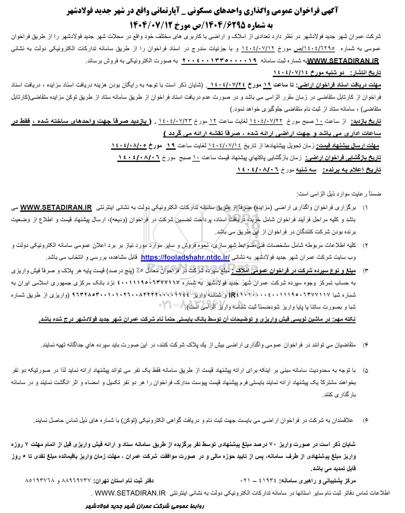 شرکت عمران شهر جدید فولاد شهر در نظر دارد تعدادی از املاک و اراضی با کاربریهای مختلف خود واقع در محلات شهر جدید فولادشهر را از طریق فراخوان عمومی به شماره 1404/6295 / ص مورخ 1404.7.12 و با جزئیات مندرج در اسناد فراخوان را از طریق سامانه تدارکات الکترونیکی دولت به نشانی (ستاد ایران) به شماره ثبت سامانه 2004001335000019 به صورت الکترونیکی به فروش برساند.