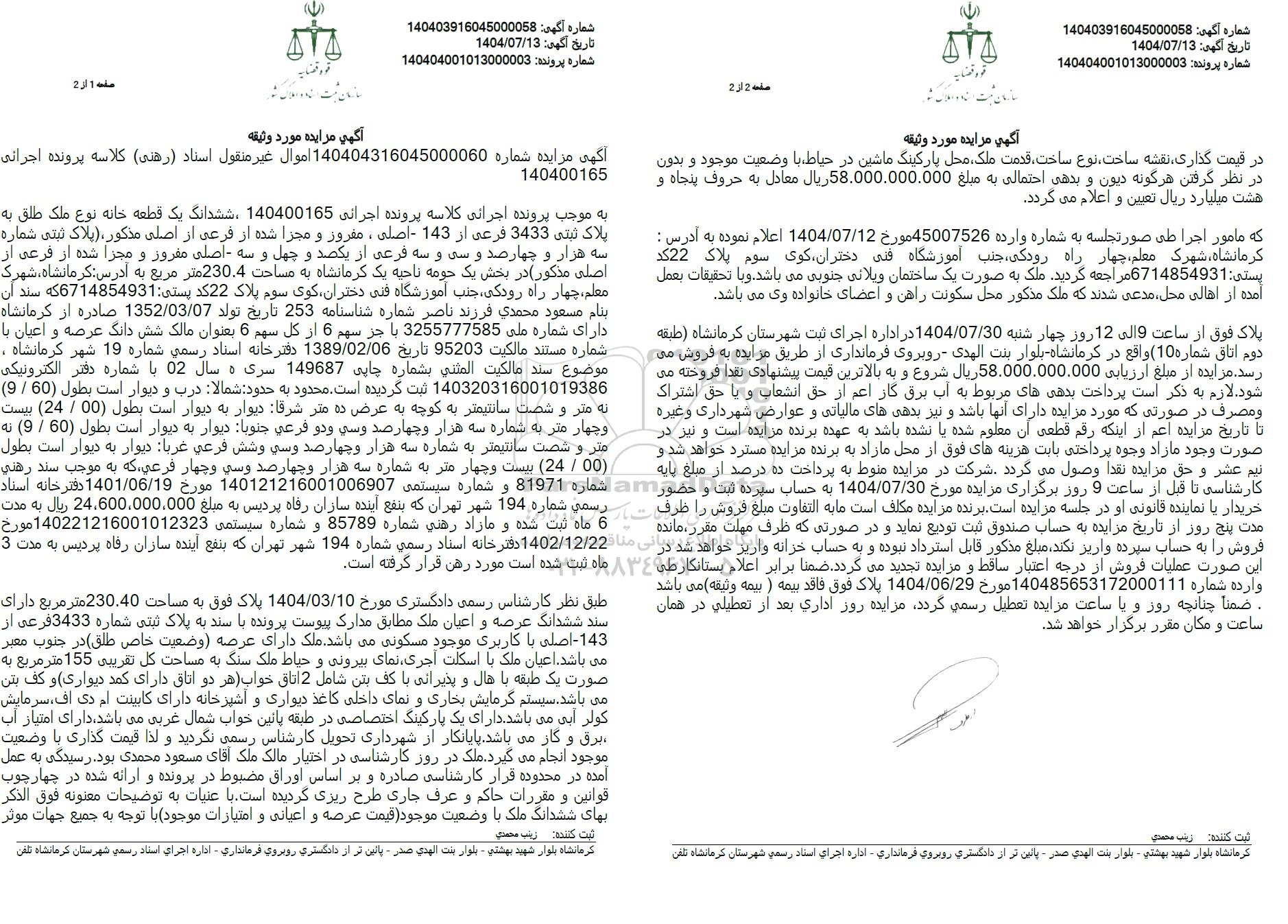 به موجب پرونده اجرائی کلاسه پرونده اجرائی 140400165 ، ششدانگ یک قطعه خانه نوع ملک طلق به پلاک ثبتی 3433 فرعی از 143 - اصلی ، مفروز و مجزا شده از فرعی از اصلی مذکور، پلاک ثبتی شماره سه هزار و چهارصد و سی و سه فرعی از یکصد و چهل و سه اصلی مفروز و مجزا شده از فرعی از اصلی مذکور در بخش یک حومه ناحیه یک کرمانشاه به مساحت 230.4 متر مربع به آدرس کرمانشاه، شهرک معلم چهار راه رودکی جنب آموزشگاه فنی دختران کوی سوم پلاک 22 کد پستی: 6714854931 که سند آن بنام مسعود محمدي فرزند ناصر شماره شناسنامه 253 تاریخ تولد 1352/03/07 صادره از کرمانشاه دارای شماره ملی 3255777585 با جز سهم 6 از کل سهم 6 بعنوان مالک شش دانگ عرصه و اعیان با شماره مستند مالکیت 95203 تاریخ 1389.02.06 دفترخانه اسناد رسمی شماره 19 شهر کرمانشاه ، موضوع سند مالكيت المثني بشماره چاپی 149687 سری ۵ سال 02 با شماره دفتر الکترونیکی 140320316001019386 ثبت گردیده است. محدود به حدود شمالا درب و دیوار است بطول (60 / 9) نه متر و شصت سانتیمتر به کوچه به عرض ده متر شرقا دیوار به دیوار است بطول (00 / 24) بیست و چهار متر به شماره سه هزار و چهارصد و سي و دو فرعي جنوبا دیوار به دیوار است بطول (60 / 9) نه متر و شصت سانتیمتر به شماره سه هزار و چهارصد و سي و شش فرعي غربا دیوار به دیوار است بطول (00 / 24 بیست و چهار متر به شماره سه هزار و چهارصد و سی و چهار فرعی که به موجب سند رهني شماره 81971 و شماره سیستمی 140121216001006907 مورخ 1401.06.19 دفترخانه اسناد رسمي شماره 194 شهر تهران که بنفع آینده سازان رفاه پردیس به مبلغ 24,600,000,000 ریال به مدت 6 ماه ثبت شده و مازاد رهني شماره 85789 و شماره سیستمی 140221216001012323 مورخ 1402.12.22 دفترخانه اسناد رسمی شماره 194 شهر تهران که بنفع آینده سازان رفاه پردیس به مدت 3 ماه ثبت شده است مورد رهن قرار گرفته است.
