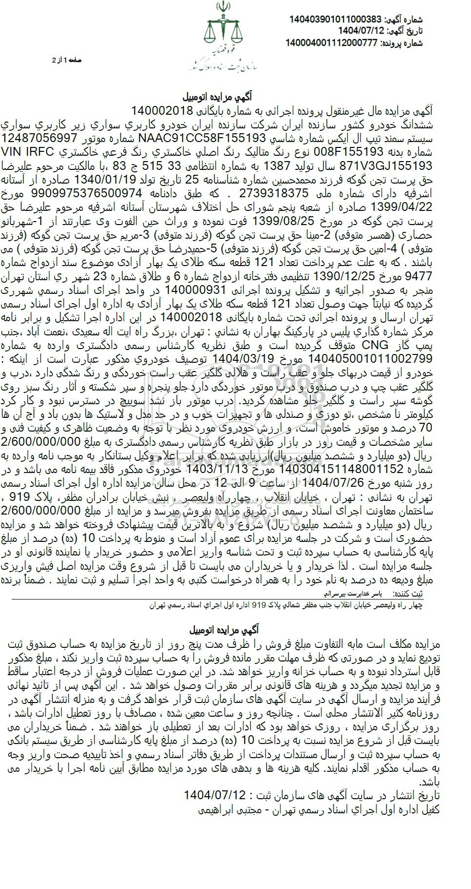 سیستم سمند تیپ ال ایکس شماره شاسی NAAC91CC58F155193 شماره موتور 12487056997 شماره بدنه 008F155193 نوع رنگ متالیک رنگ اصلی خاکستری رنگ فرعی خاكستری VIN IRFC V3GJ155193 871 سال تولید 1387 به شماره انتظامی 51533 ج 83 با مالکیت مرحوم علیرضا حق پرست تجن گوکه فرزند محمد حسین شماره شناسنامه 25 تاریخ تولد 1340.01.19 صادره از آستانه اشرفیه دارای شماره ملی 2739318375 . که طبق دادنامه 9909975376500974 مورخ 1399.04.22 صادره از شعبه پنجم شورای حل اختلاف شهرستان استانه اشرفیه مرحوم علیرضا حق پرست تجن گوکه در مورخ 1399.08.25 فوت نموده و وراث حین الفوت وی عبارتند از 1 شهربانو حصاری (همسر متوفی 2 - مینا حق پرست تجن گوکه فرزند (متوفی 3 - مریم حق پرست تجن گوکه فرزند متوفی ) 4- امین حق پرست تجن گوکه فرزند) (متوفی 5- حمیدرضا حق پرست تجن گوکه فرزند متوفی ) می باشند . که به علت عدم پرداخت تعداد 121 قطعه سکه طلای یک بهار آزادی موضوع سند ازدواج شماره 9477 مورخ 1390.12.25 تنظیمی دفترخانه ازدواج شماره 6 و طلاق شماره 23 شهر ری استان تهران منجر به صدور اجرائیه و تشکیل پرونده اجرائی 140000931 در واحد اجرای اسناد رسمی شهرری گردیده که نیابتا جهت وصول تعداد 121 قطعه سکه طلای یک بهار آزادی به اداره اول اجرای اسناد رسمی تهران ارسال و پرونده اجرائی تحت شماره بایگانی 140002018 در این اداره اجرا تشکیل و برابر نامه مرکز شماره گذاری پلیس در پارکینگ بهاران به نشانی : تهران بزرگ راه ایت اله سعیدی ، نعمت آباد ، جنب پمپ کار CNG متوقف گردیده است و طبق نظریه کارشناس رسمی دادگستری وارده به شماره 140405001011002799 مورخ 1404.03.19 توصیف خودروی مذكور عبارت است از اینکه : خودرو از قیمت دربهای جلو و عقب راست و هلالی گلگیر عقب راست خوردگی و رنگ شدگی دارد ، درب و گلگیر عقب چپ و درب صندوق و درب موتور خوردگی دارد جلو پنجره و سیر شکسته و آثار رنگ سبز روی گوشه سیر راست و گلگیر جلو مشاهده گردید درب موتور باز نشد سوییچ در دسترس نبود و کار کرد کیلومتر نا مشخص تو دوری و صندلی ها و تجهیزات خوب و در حد مدل و لاستیکها بدون یاد و آج آن ها 70 درصد و موتور خاموش است و ارزش خودروی مورد نظر با توجه به وضعیت ظاهری و کیفیت فنی و سایر مشخصات و قیمت روز در بازار طبق نظریه کارشناس رسمی دادگستری به مبلغ 2.600.000.000 ریال دو میلیارد و ششصد میلیون ریال ارزیابی شده که برابر اعلام وکیل بستانکار به موجب نامه وارده به شماره 140304151148001152 مورخ 1403.11.13 خودروی مذکور فاقد بیمه نامه می باشد و در روز شنبه مورخ 1404.07.26 از ساعت 9 الی 12 در محل سالن مزایده اداره اول اجرای اسناد رسمی تهران به نشانی : تهران، خیابان انقلاب، چهارراه ولیعصر، نبش خیابان برادران مظفر پلاک 919 . ساختمان معاونت اجرای اسناد رسمی از طریق مزایده بفروش میرسد و مزایده از مبلغ 2.600.000.000 ریال دو میلیارد و ششصد میلیون ریال شروع و به بالاترین قیمت پیشنهادی فروخته خواهد شد و مزایده حضوری است و شرکت در جلسه مزایده برای عموم آزاد است و منوط به پرداخت 10 (ده) درصد از مبلغ پایه کارشناسی به حساب سپرده ثبت و تحت شناسه واریز اعلامی و حضور خریدار یا نماینده قانونی او در جلسه مزایده است . لذا خریدار و یا خریداران می بایست تا قبل از شروع وقت مزایده اصل فیش واریزی مبلغ ودیعه ده درصد به نام خود را به همراه درخواست کتبی به واحد اجرا تسلیم و ثبت نمایند . ضمنا برنده مزایده مکلف است ما به التفاوت مبلغ فروش را ظرف مدت پنج روز از تاریخ مزایده به حساب صندوق ثبت تودیع نماید و در صورتی که ظرف مهلت مقرر مانده فروش را به حساب سپرده ثبت واریز نکند ، مبلغ مذکور قابل استرداد نبوده و به حساب خزانه واریز خواهد شد. در این صورت عملیات فروش از درجه اعتبار ساقط و مزایده تجدید میگردد و هزینه های قانونی برابر مقررات وصول خواهد شد. این آگهی پس از تائید نهانی فرآیند مزایده و ارسال آگهی در سایت آگهی های سازمان ثبت قرار خواهد گرفت و به منزله انتشار آگهی در روزنامه کثیر الانتشار محلی است. چنانچه روز و ساعت معین شده، مصادف با روز تعطیل ادارات باشد . روز برگزاری مزایده، روزی خواهد 