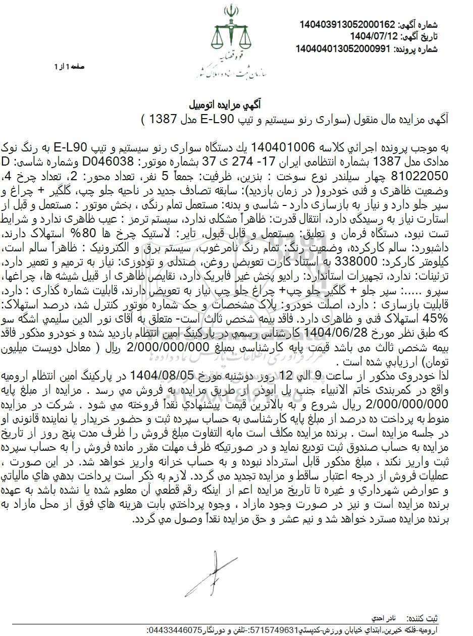 آگهی مزایده مال منقول سواری رنو سیستیم و تیپ 90-E مدل 1387