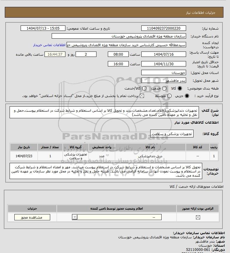 شرح کلی نیاز: تجهیزات دندانپزشکی(اقلام،تعداد،مشخصات،برند و تحویل کالا بر اساس استعلام و شرایط شرکت در استعلام پیوست.حمل و نقل و تخلیه بر عهده تامین کننده می باشد)