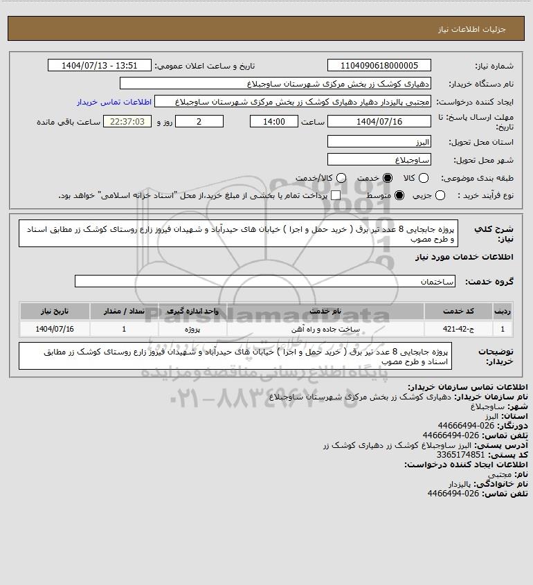 توضیحات خریدار:پروژه جابجایی 8 عدد تیر برق ( خرید حمل و اجرا ) خیابان های حیدرآباد و شهیدان فیروز زارع روستای کوشک زر مطابق اسناد و طرح مصوب