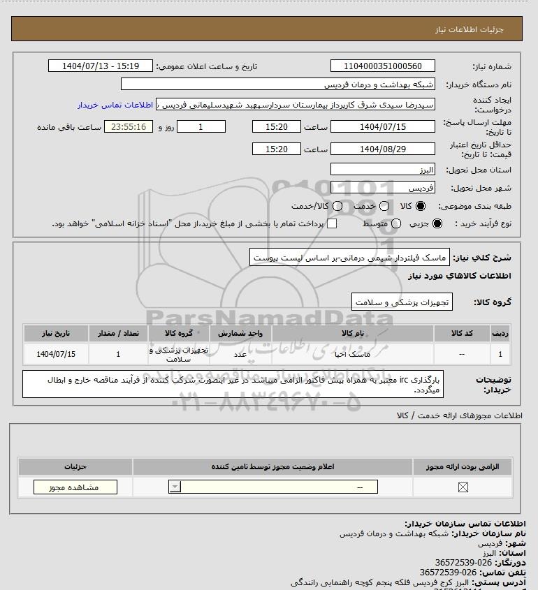 استعلام بها و موضوع استعلام استعلام ماسک فیلتردار شیمی درمانی-بر اساس لیست پیوست به اطلاع کلیه شرکتها و افراد متخصص واجد شرایط میرساند، آگهی گذار در نظر دارد از طریق استعلام بها، نسبت به انتخاب و دریافت پیشنهادات اقدام نماید. این استعلام با کد آگهی ثبت شده در سامانه خبرگزاری پارس نماد : 9649757 منتشر شده است. مشخصات استعلام : تاریخ شروع استعلام: 1404/07/13 آخرین مهلت ارسال پیشنهاد قیمت : 1404/07/15 و محل اجرای پروژه : استان البرز میباشد. استعلام قیمت مورد درخواست : استعلام ماسک فیلتردار شیمی درمانی-بر اساس لیست پیوست با دستهبندیهای تخصصی و گروه های مرتبط : البسه و پوشاک, خدمات و تجهیزات آزمایشگاهی و پزشکی, استعلام اطلاع رسانی میگردد.