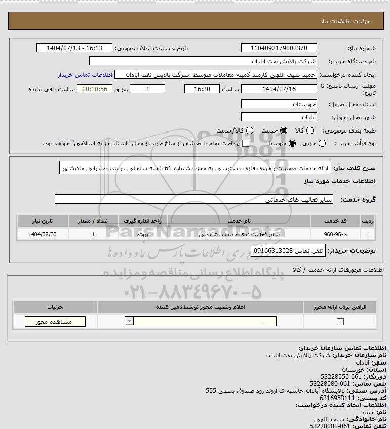 شرح کلی نیاز: ارائه خدمات تعمیرات راهروی فلزی دسترسی به مخزن شماره 61 ناحیه ساحلی در بندر صادراتی ماهشهر
