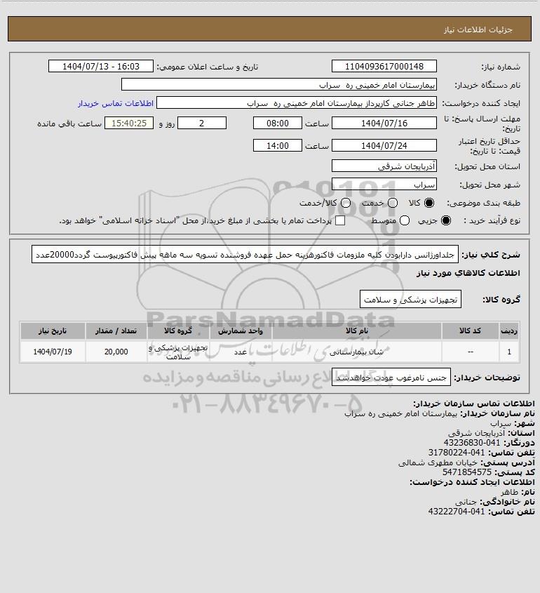 1 -- شان بیمارستانی عدد تجهیزات پزشکی و سلامت 20,000 1404/07/19