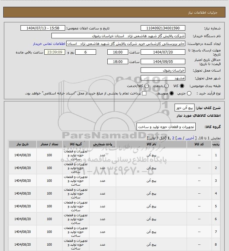 نام دستگاه خریدار:شرکت پالایش گاز شهید هاشمی نژاد استان خراسان رضوی