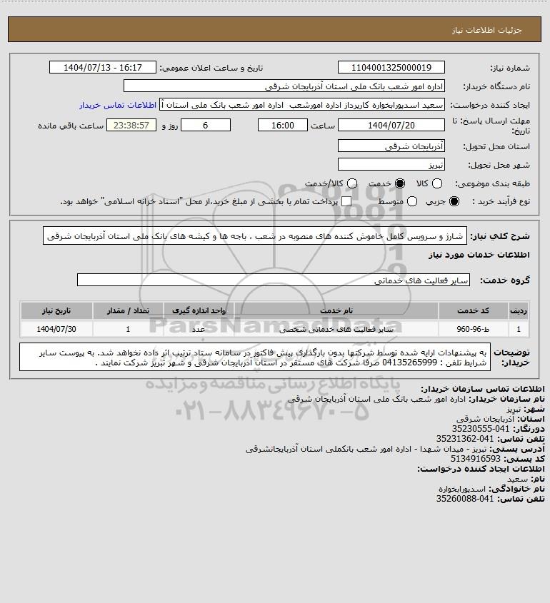 شرح کلی نیاز: شارژ و سرویس کامل خاموش کننده های منصوبه در شعب ، باجه ها و کیشه های بانک ملی استان آذربایجان شرقی