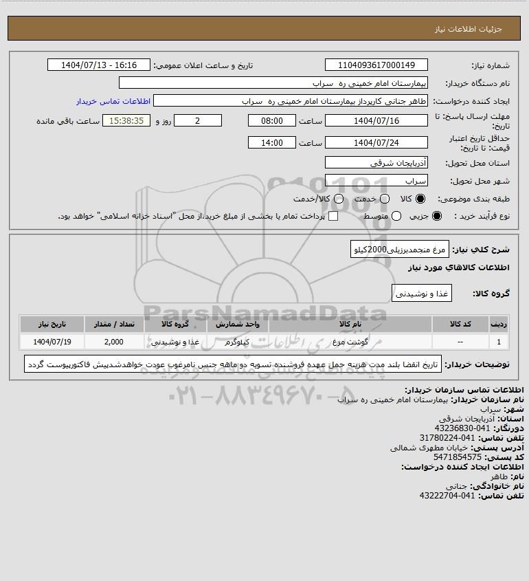 شرح کلی نیاز: مرغ منجمدبرزیلی2000کیلو