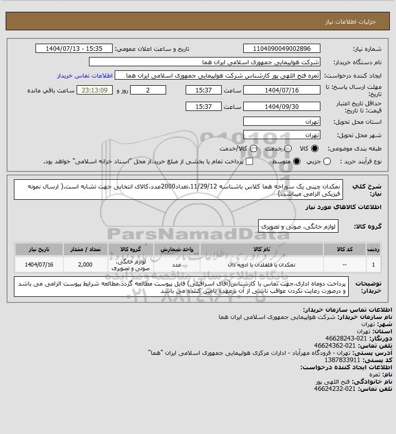 شرح کلی نیاز: نمکدان چینی یک سوراخه هما کلاس باشناسه 11/29/12،تعداد2000عدد،کالای انتخابی جهت تشابه است.( ارسال نمونه فیزیکی الزامی میباشد.)