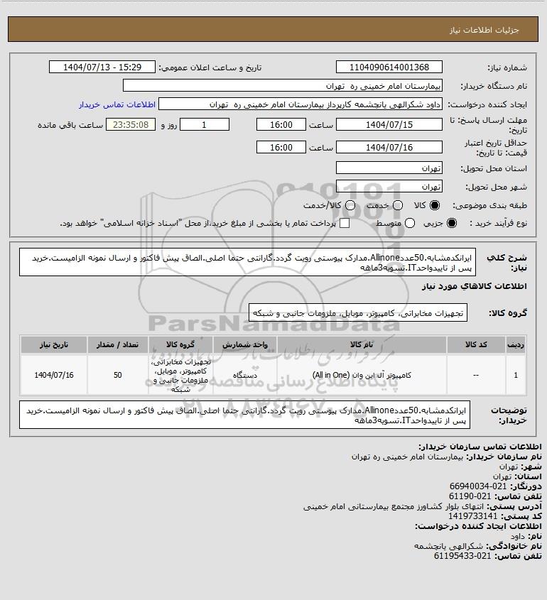شرح کلی نیاز: ایرانکدمشابه.50عددAllinone.مدارک پیوستی رویت گردد.گارانتی حتما اصلی.الصاق پیش فاکتور و ارسال نمونه الزامیست.خرید پس از تاییدواحدIT.تسویه3ماهه