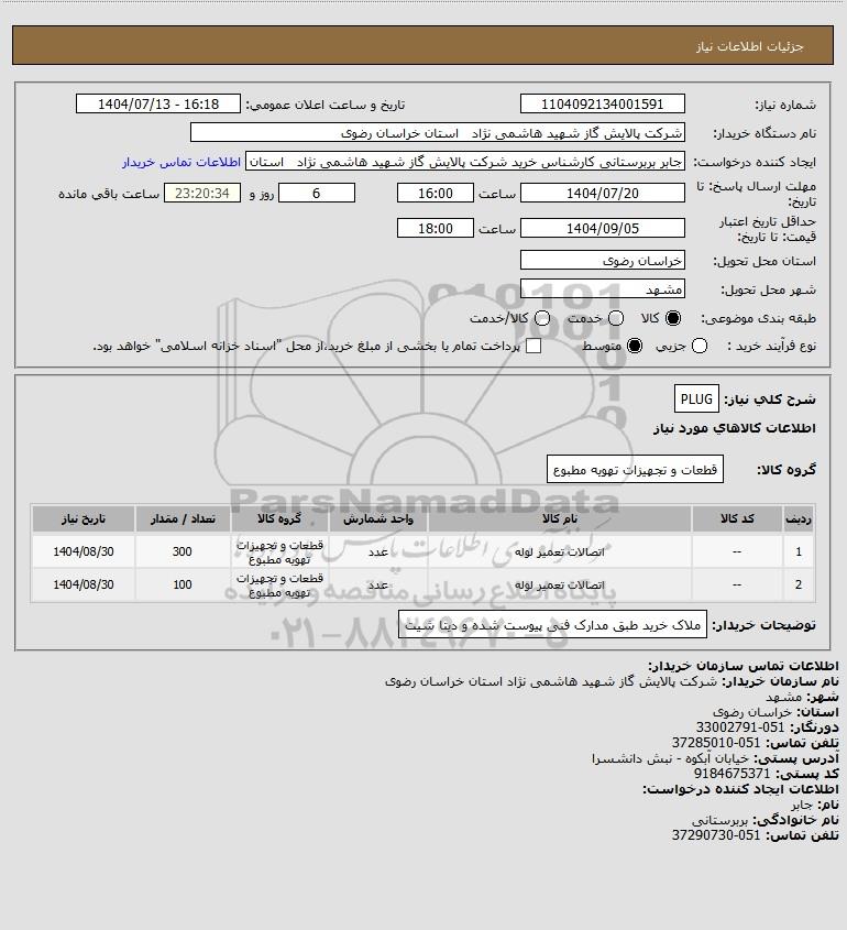 نام دستگاه خریدار:شرکت پالایش گاز شهید هاشمی نژاد استان خراسان رضوی