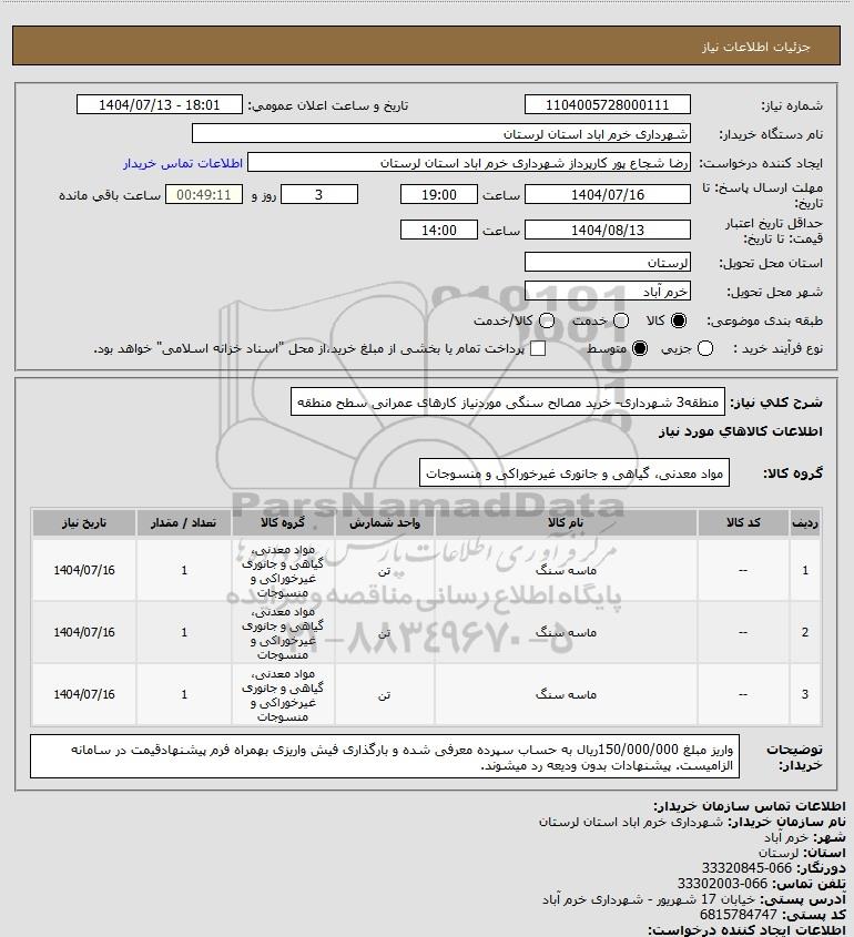شرح کلی نیاز: منطقه3 شهرداری- خرید مصالح سنگی موردنیاز کارهای عمرانی سطح منطقه