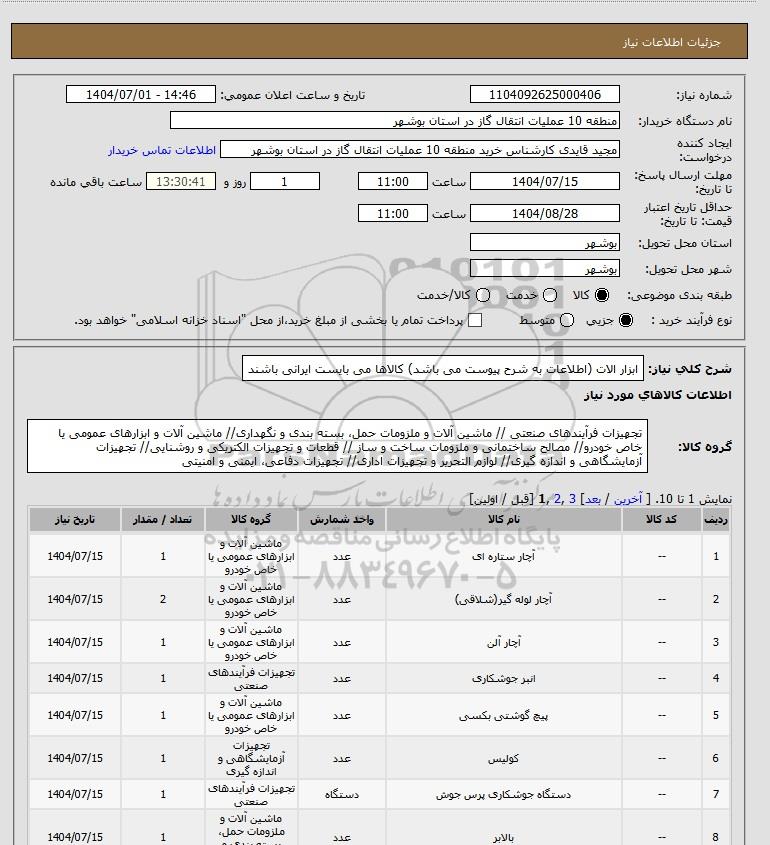 شرح کلی نیاز: ابزار الات (اطلاعات به شرح پیوست می باشد) کالاها می بایست ایرانی باشند