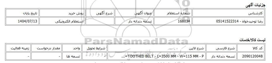 رضا توحیدخواه - 05141522314 | 168034 | تسمه دندانه دار | استعلام الکترونیکی | 1404/07/13 |