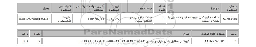 52503815 | ساخت گیربکس مربوط به فیدر - مطابق با نمونه و اسناد | 1 | ساخت تجهیزات و قطعات یدکی | کشوری | 1404/07/11 | علیرضا افراسیابی | A.AFRASYABI@KSC.IR |