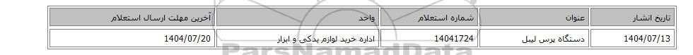 | 1404/07/13 | دستگاه پرس لیبل | 14041724 | اداره خرید لوازم یدکی و ابزار | 1404/07/20 |