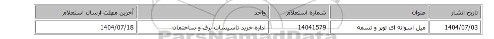| 1404/07/03 | میل اسوانه ای توپر و تسمه | 14041579 | اداره خرید تاسیسات برق و ساختمان | 1404/07/18 |