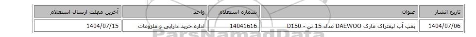 | 1404/07/06 | پمپ آب لیفتراک مارک DAEWOO مدل 15 تن - D150 | 14041616 | اداره خرید دارایی و ملزومات | 1404/07/15 |