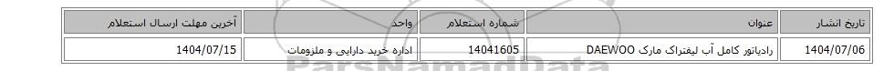 | 1404/07/06 | رادیاتور کامل آب لیفتراک مارک DAEWOO | 14041605 | اداره خرید دارایی و ملزومات | 1404/07/15 |