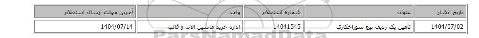 | 1404/07/02 | تأمین یک ردیف پیچ سوراخکاری | 14041545 | اداره خرید ماشین الات و قالب | 1404/07/14 |