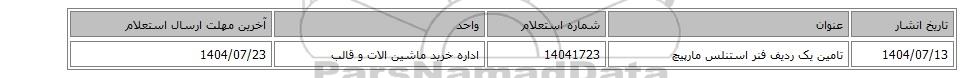| 1404/07/13 | تامین یک ردیف فنر استنلس مارپیچ | 14041723 | اداره خرید ماشین الات و قالب | 1404/07/23 |