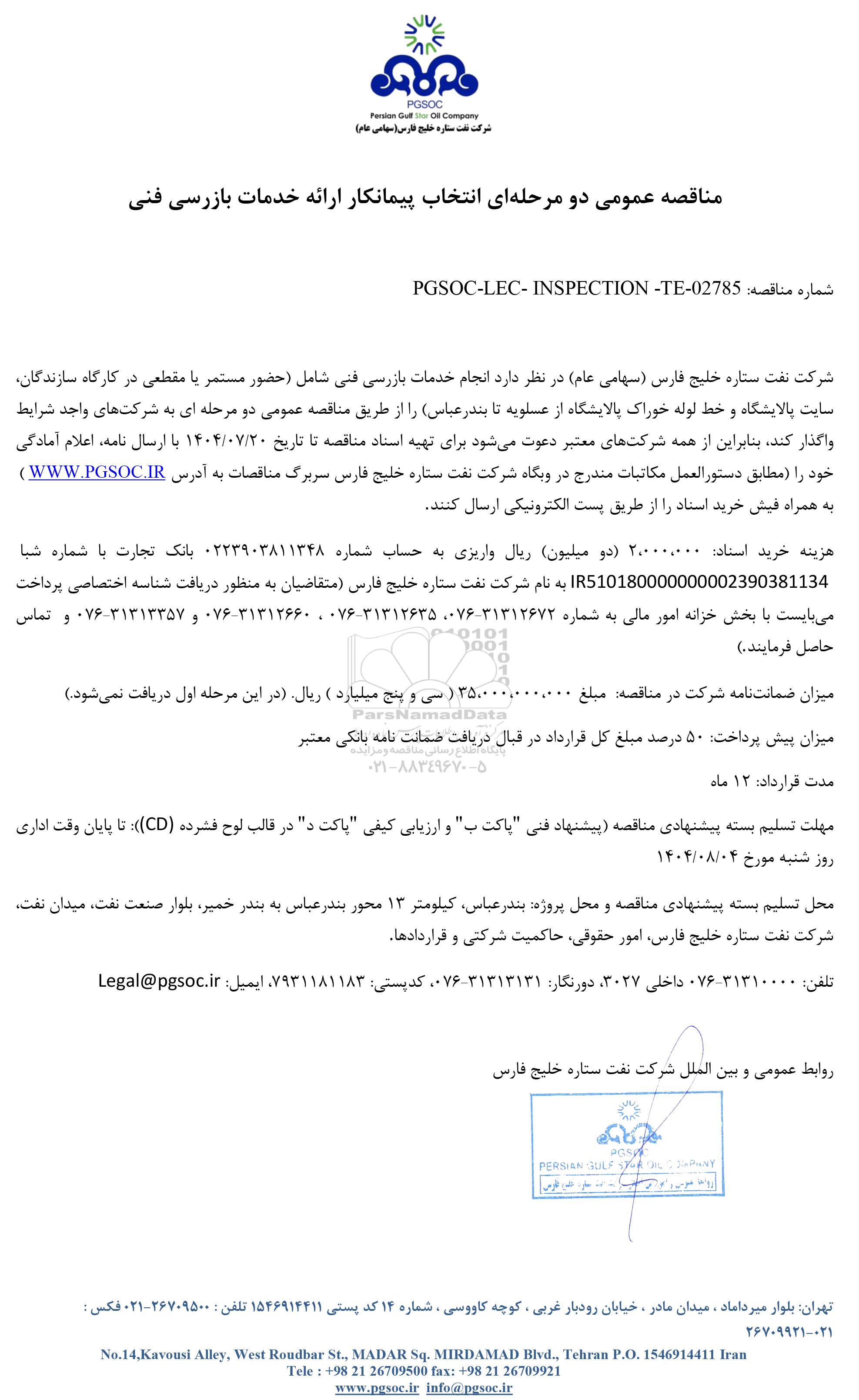 شماره مناقصه: PGSOC-LEC- INSPECTION -TE- 02785