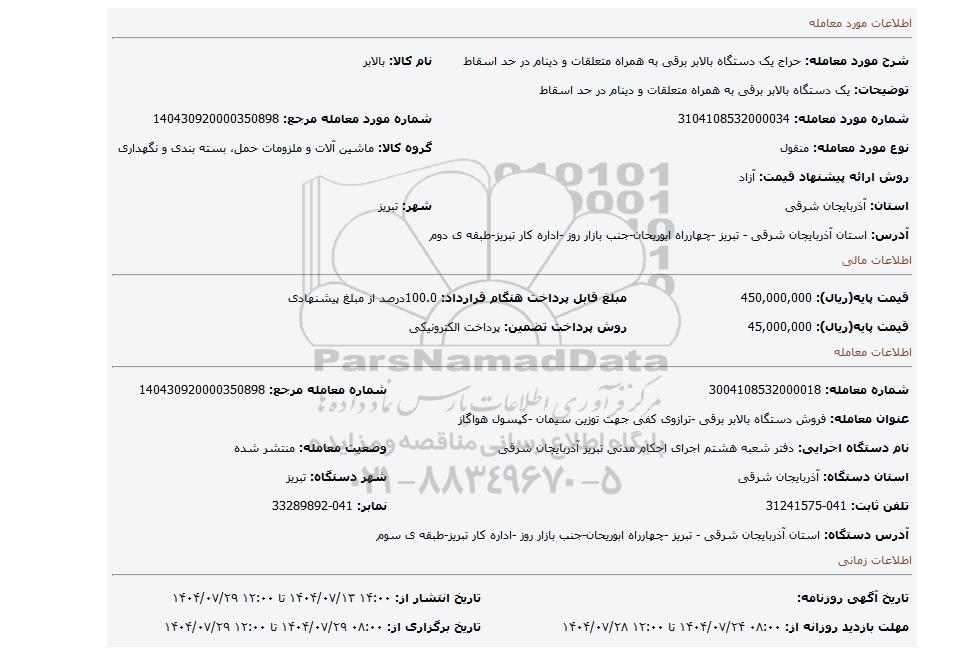مزایده عمومی مزایده یک دستگاه بالابر برقی به همراه متعلقات و دینام در حد اسقاط برگزار میگردد. از کلیه افراد متخصص و شرکتهای واجد شرایط دعوت به عمل میآید تا در این مزایده با کد خبرگزاری پارس نماد : 9651173 شرکت نمایند تاریخ شروع مزایده : 1404/07/13 مهلت شرکت در مزایده: تا پایان روز 1404/07/29 مکان برگزاری اموال واگذاری استانهای آذربایجان شرقی و دستهبندیهای مربوط به این حراجی تجهیزات کارخانه ها و ماشین آلات صنعتی, آسانسور میباشد.