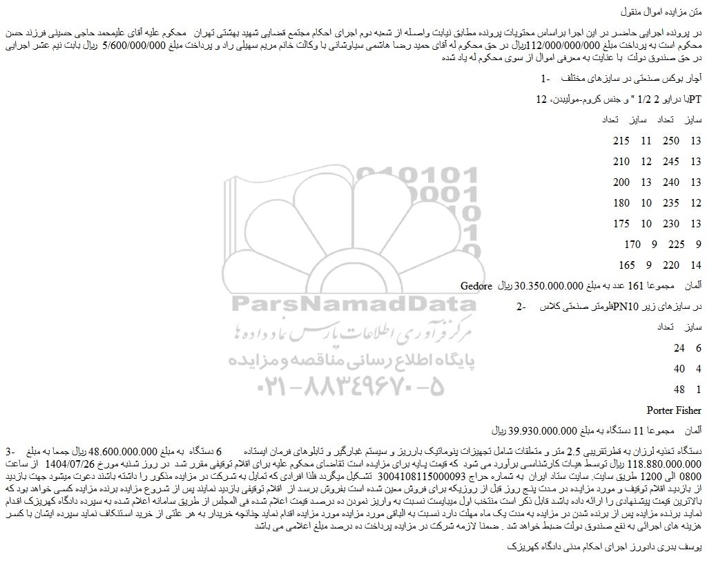 3- دستگاه تغذیه لرزان به قطرتقریبی 2.5 متر و متعلقات شامل تجهیزات پنوماتیک بارریز و سیستم غبارگیر و تابلوهای فرمان ایستاده 6 دستگاه به مبلغ 48.600.000.000 ریال جمعا به مبلغ 118.880.000.000 ریال توسط هیات کارشناسی برآورد می شود که قیمت پایه برای مزایده است تقاضای محکوم علیه برای اقلام توقیفی مقرر شد در روز شنبه مورخ 1404/07/26 از ساعت 0800 الی 1200 طریق سایت. سایت ستاد ایران به شماره حراج 3004108115000093 تشکیل میگردد فلذا افرادی که تمایل به شرکت در مزایده مذکور را داشته باشند دعوت میشود جهت بازدید از بازدید اقلام توقیف و مورد مزایده در مدت پنج روز قبل از روزیکه برای فروش معین شده است بفروش برسد از اقلام توقیفی بازدید نمایند پس از شروع مزایده برنده مزایده کسی خواهد بود که بالاترین قیمت پیشنهادی را ارائه داده باشد قابل ذکر است منتخب اول میبایست نسبت به واریز نمودن ده درصد قیمت اعلام شده فی المجلس از طریق سامانه اعلام شده به سپرده دادگاه کهریزک اقدام نماید برنده مزایده پس از برنده شدن در مزایده به مدت یک ماه مهلت دارد نسبت به الباقی مورد مزایده مورد مزایده اقدام نماید چنانچه خریدار به هر علتی از خرید استنکاف نماید سپرده ایشان با کسر هزینه های اجرائی به نفع صندوق دولت ضبط خواهد شد . ضمنا لازمه شرکت در مزایده پرداخت ده درصد مبلغ اعلامی می باشد