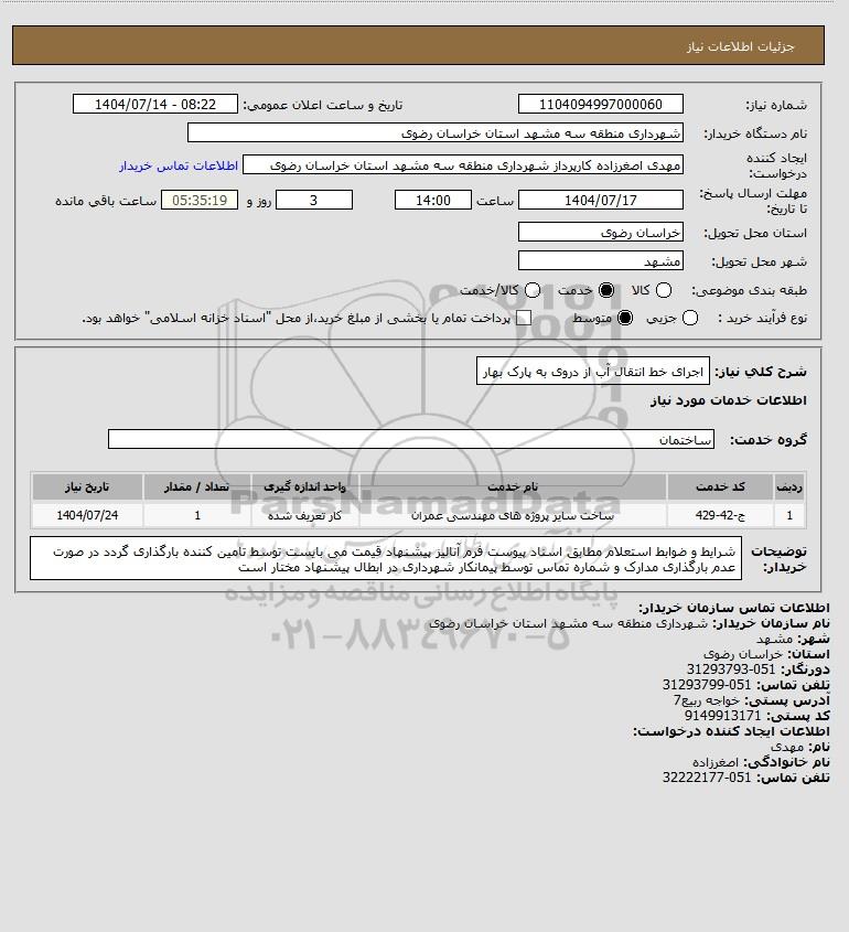 شرح کلی نیاز: اجرای خط انتقال آب از دروی به پارک بهار