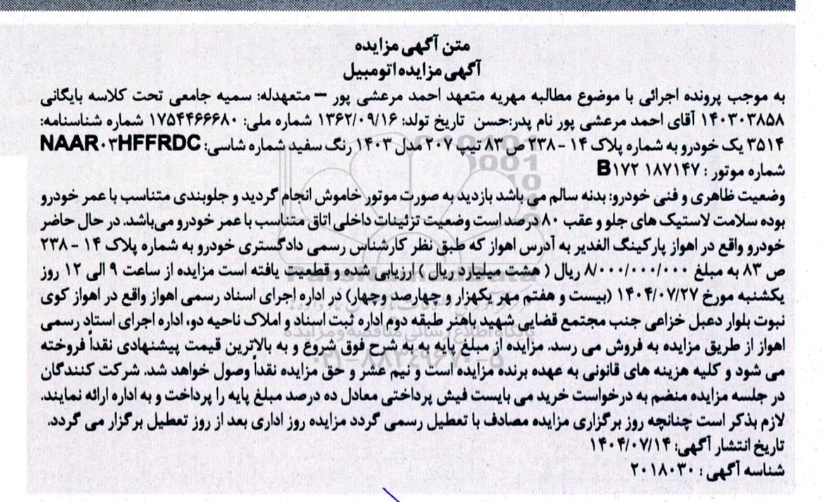 مزایده فروش یک دستگاه خودرو پژو 207, مزایده فروش یک دستگاه خودرو پژو 207
