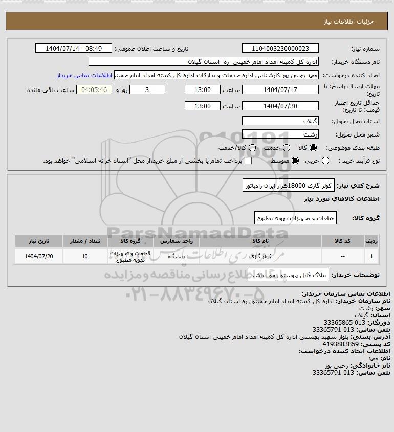 شرح کلی نیاز: کولر گازی 18000هزار ایران رادیاتور