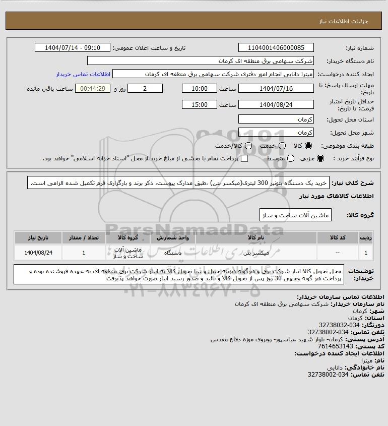 نام سازمان خریدار: شرکت سهامی برق منطقه ای کرمان