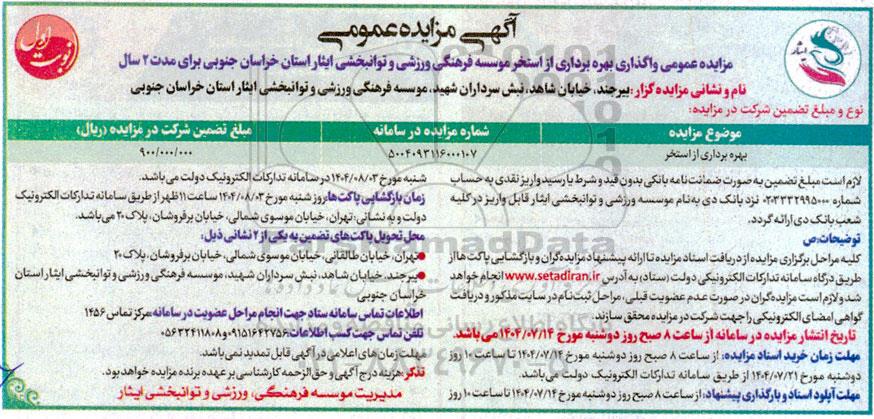 نام و نشانی مزایده گزار: بیرجند، خیابان شاهد، نبش سرداران شهید فرهنگی، ورزشی و توانبخشی ایثار استان خراسان جنوبی
