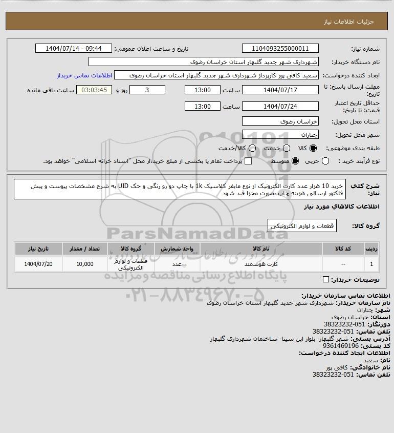 | 1 | -- | کارت هوشمند | عدد | قطعات و لوازم الکترونیکی | 10,000 | 1404/07/20 |