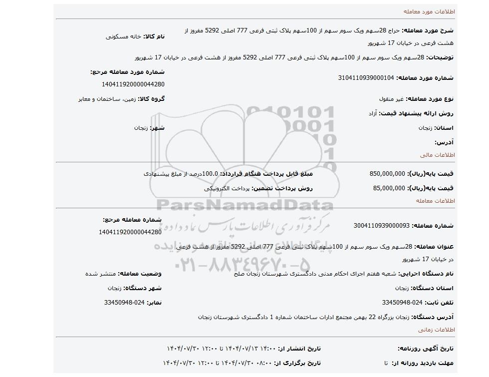 | شرح مورد معامله: حراج 28سهم ویک سوم سهم از 100سهم پلاک ثبتی فرعی 777 اصلی 5292 مفروز از هشت فرعی در خیابان 17 شهریور | نام کالا: خانه مسکونی | |