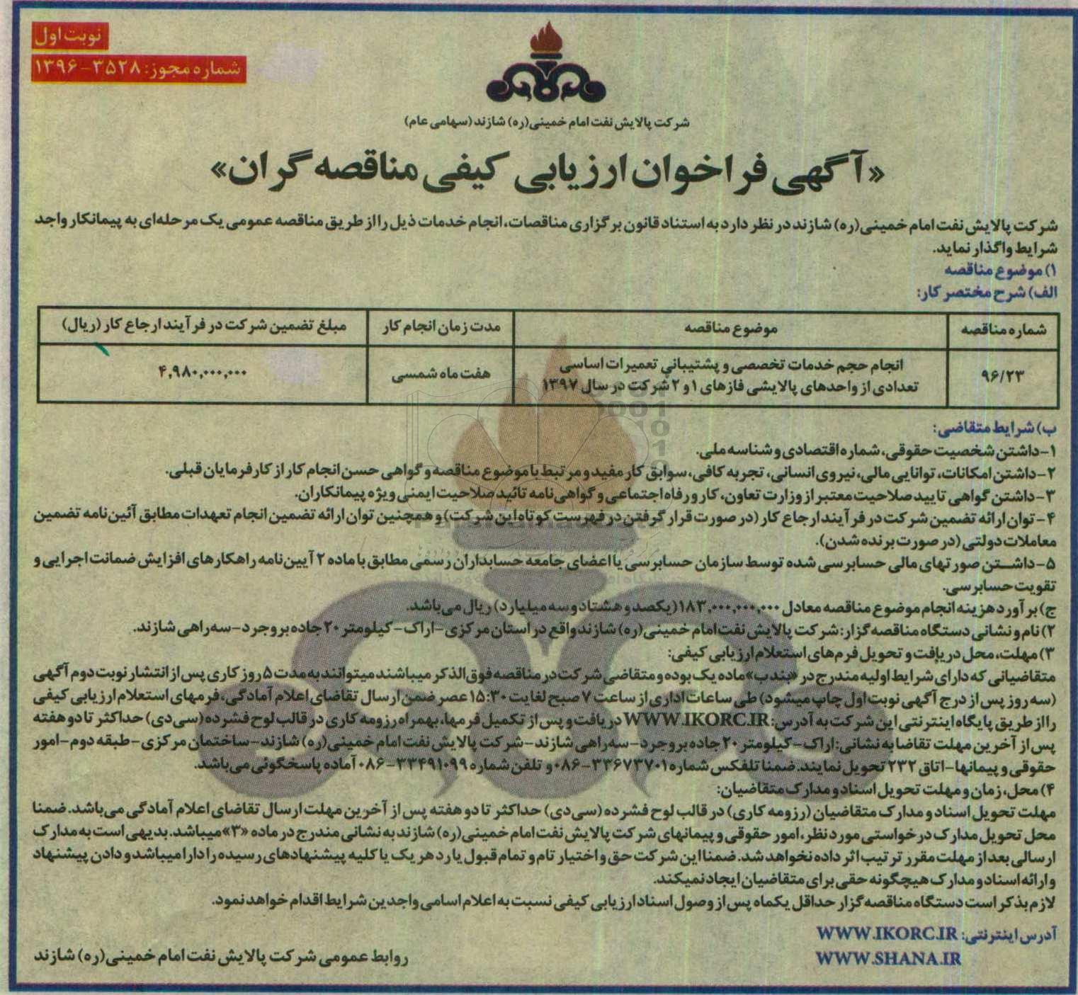 96/23 انجام خدمات تخصصی و پشتیبانی تعمیرات اساسی تعدادی از واحدهای پالایشی فازهای 1 و 2 شرکت در سال 1397